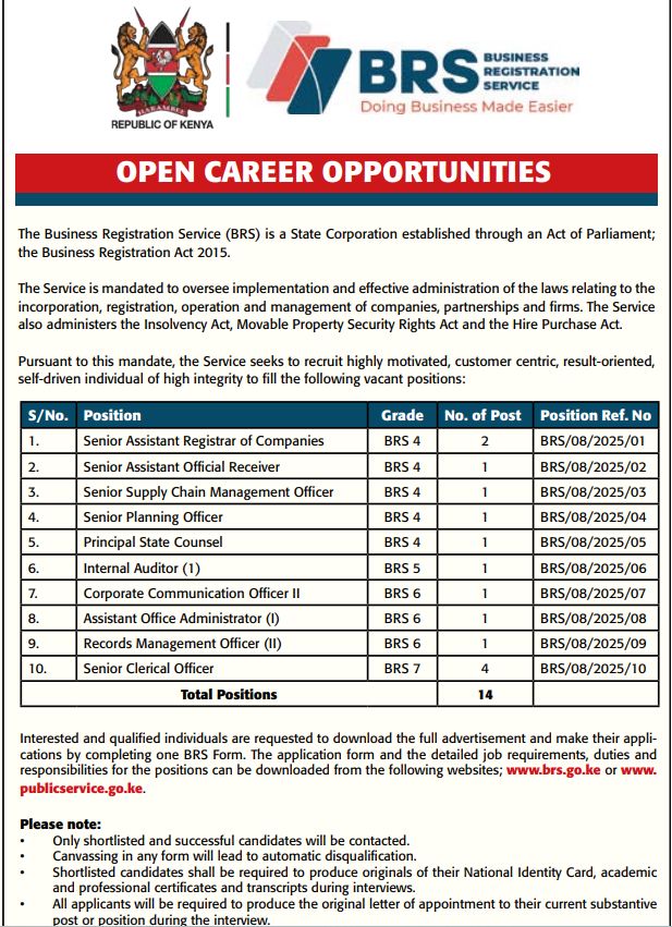 🔖 #BusinessRegistrationService #BRS #KenyaJobs #NowHiring #PublicServiceJobs #CareerOpportunities #JobOpening #WeAreHiring #IkoKaziKE