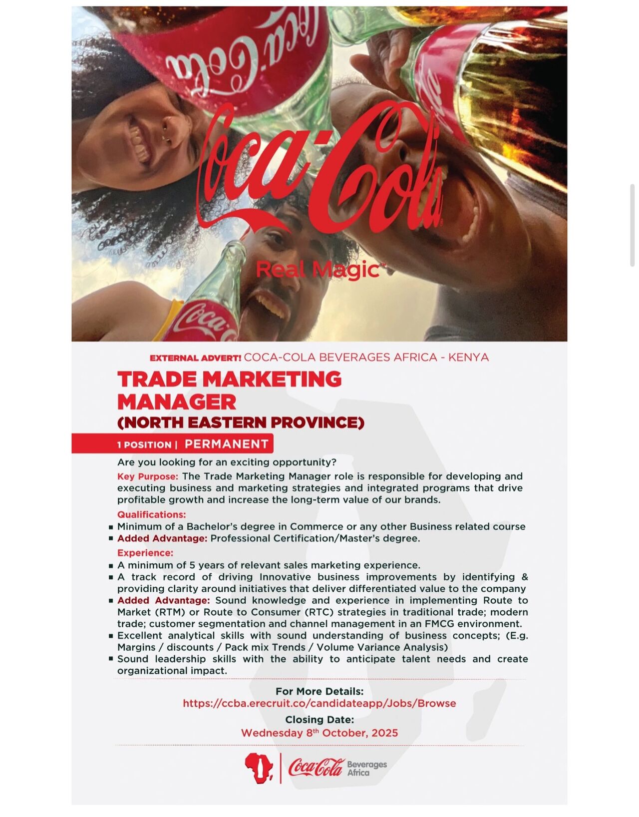 Coca-Cola Beverages Africa (CCBA) is hiring a Trade Marketing Manager to be based in Kenya – North Eastern Province. This role is perfect for a dynamic professional ready to lead impactful business and marketing strategies that drive growth and build brand value.