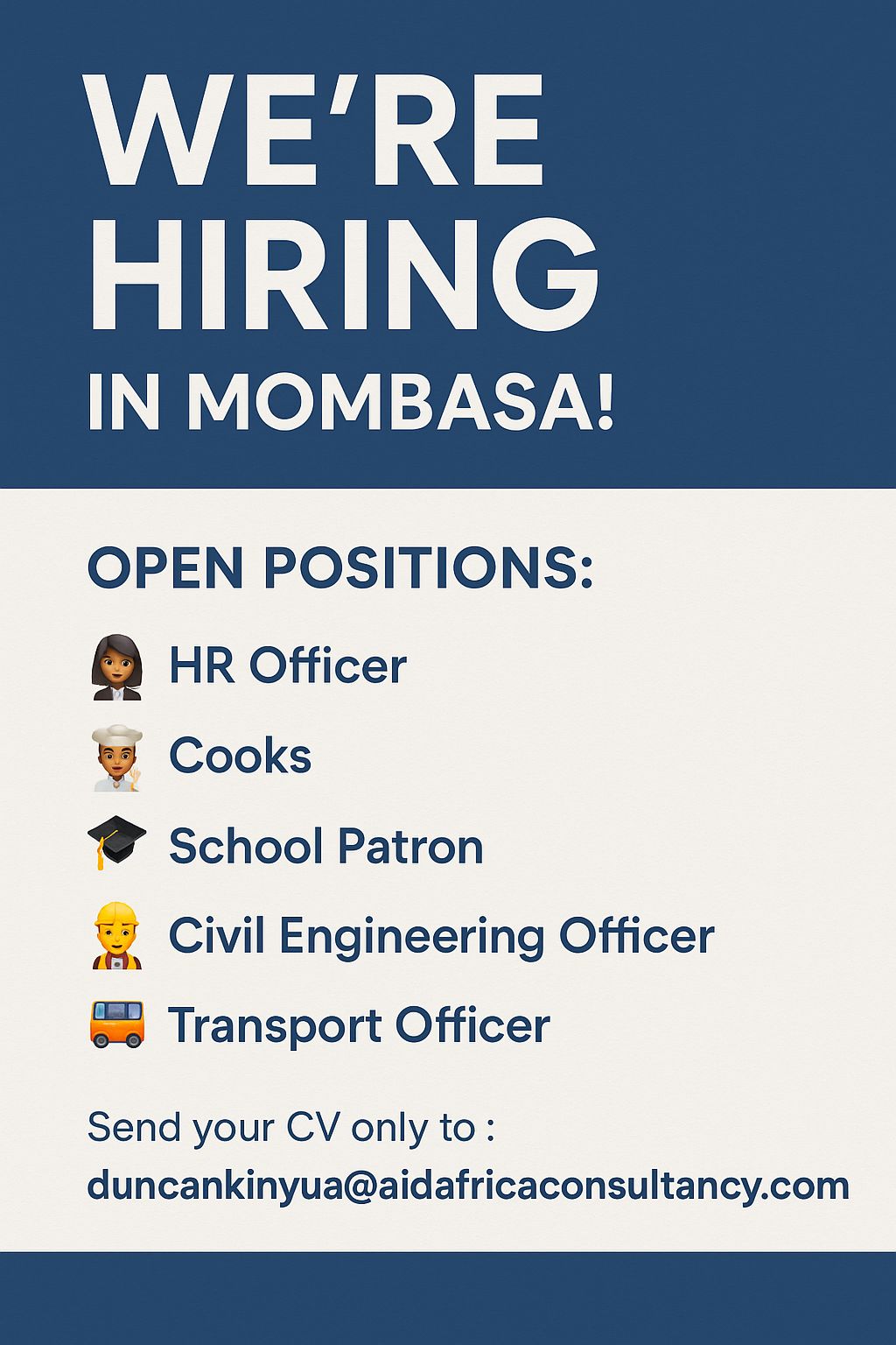 📩 Please send your CV only to: duncankinyua@aidafricaconsultancy.com #HRJobs #MombasaJobs #FaithBasedCareers #jobsinkenya#jobsinkenya #hiringalert #opportunities #jobshare #jobhiring #jobforyou #jobapportunity #jobavailable #jobseekers #jobsearch #nairobi #jobs2025 #myjobmagkenya #kenya #career #jobsinafrica #jobs #recruiting #jobinterviews #latestjobs2025 #latestjobs #jobopportunities #kenyajobs #kisumu #nakuru #nairobijobs #jobvacancykenya #jobsearchkenya #careerskenya #Ikokazike
