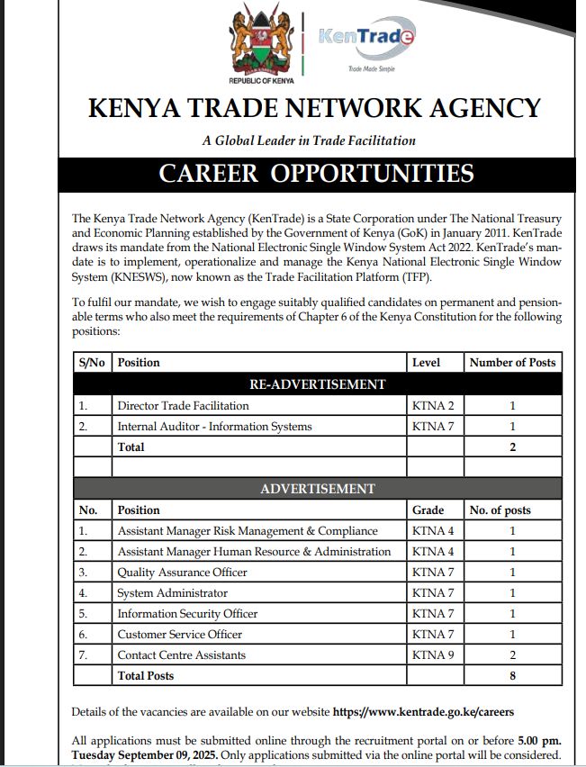 The Kenya Trade Network Agency (KenTrade), a State Corporation under the National Treasury & Economic Planning, is seeking to recruit skilled, motivated, and visionary professionals to join its team in advancing its mission of facilitating trade in Kenya and beyond. 🌍📦