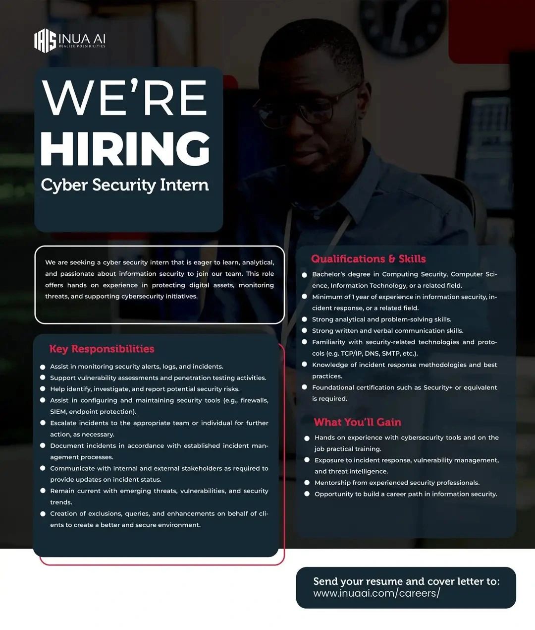 INUA AI Group is looking for a Cyber Security Intern to join their dynamic team.