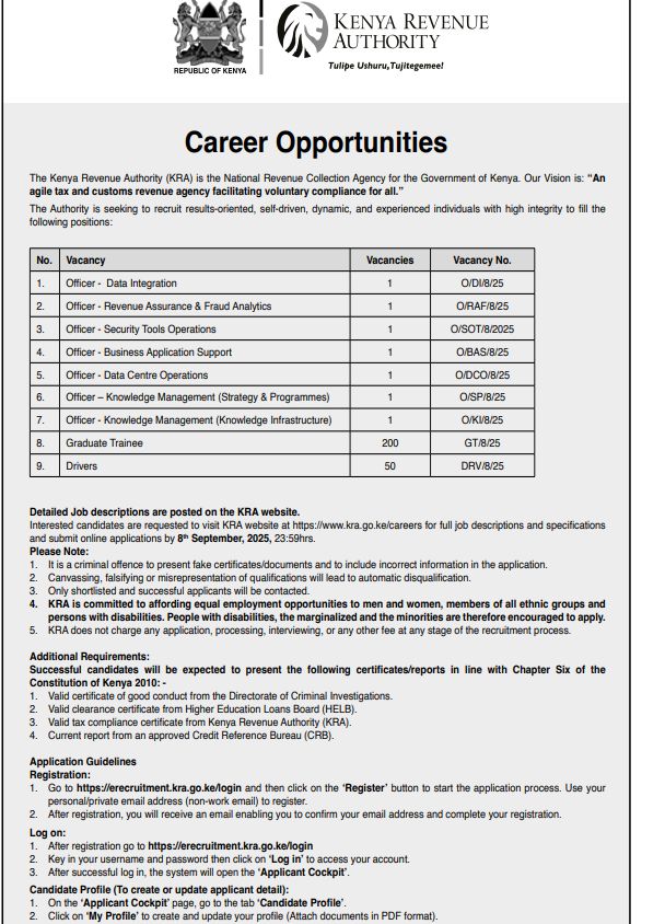 🌟 Join KRA and be part of shaping Kenya’s tax administration through innovation, professionalism, and service excellence.