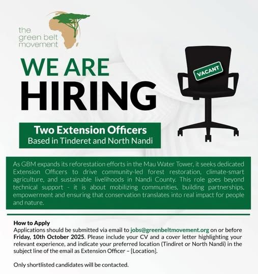 🌱 The Green Belt Movement is Hiring – Extension Officers (Nandi County: Tindiret & North Nandi) 🌍
