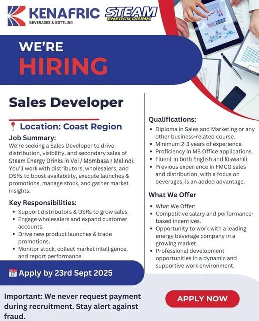 #Ajira254 #KaziNiKazi #CareersKE #SalesJobsKE #FMCGJobs #KenafricBeverages #CoastRegion #HRKenya #IkoKaziKE