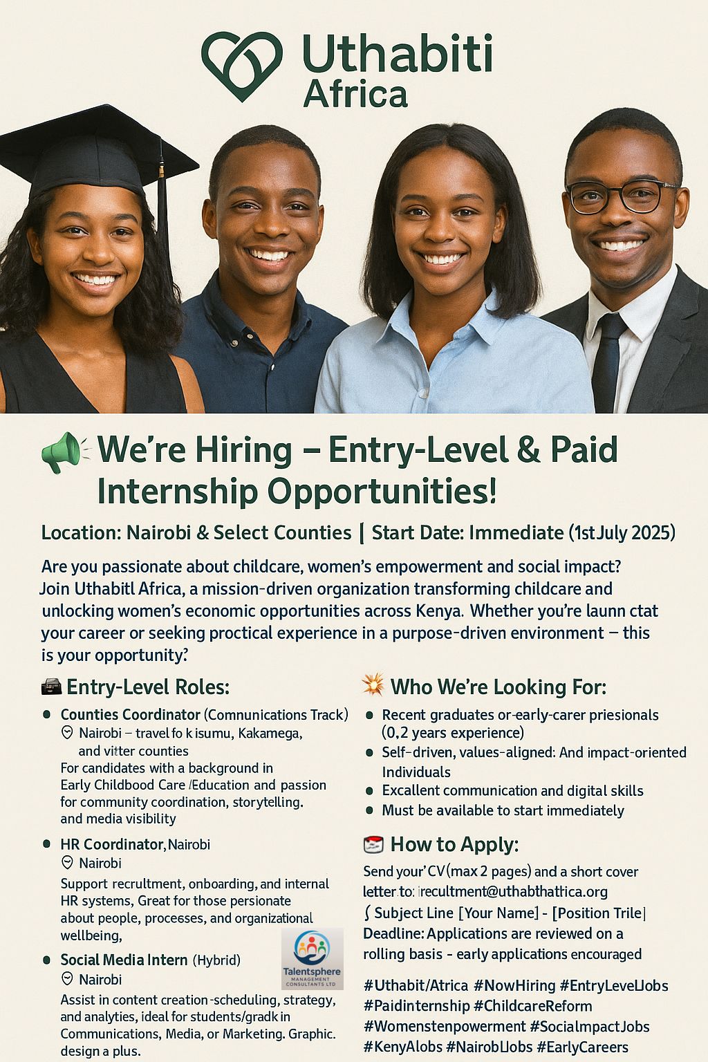 #UthabitiAfrica #NowHiring #EntryLevelJobs #PaidInternship #ChildcareReform #WomensEmpowerment #SocialImpactJobs #KenyaJobs #NairobiJobs #EarlyCareers #DigitalInternships
