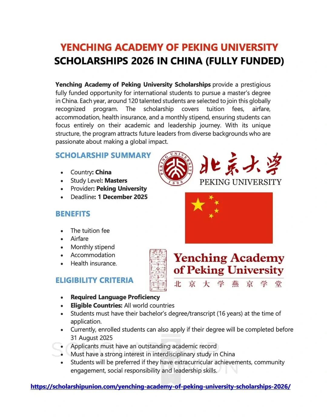 🇨🇳 Yenching Academy Scholarship 2026 – Peking University (Fully Funded) ✅ Apply Now: https://lnkd.in/dEiqsKHb ➤ Host: Peking University ➤ Degree: Master’s in China Studies ➤ Coverage: Tuition, airfare, monthly stipend, accommodation, health insurance ➤ Interdisciplinary program with field studies & research opportunities 📆 Deadline: 1 December 2025 #scholarships2025 #ScholarshipOpportunity #scholarshipopportunities #studyinchina #pekinguniversity #fullyfundedscholarship #internationalstudents #opportunity #studyabroad #china