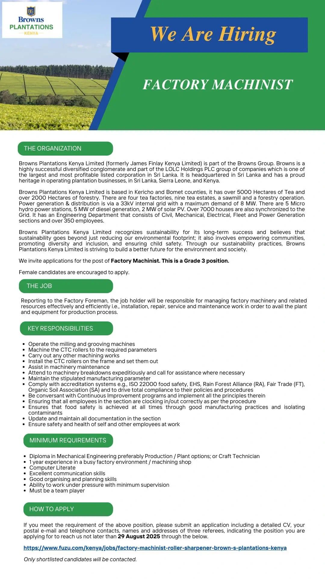 #WeAreHiring #CareerGrowth #IkoKaziKE #JobsInKenya #ManufacturingJobs #TeaIndustry #BrownsPlantations #Kericho #Bomet #Sustainability #Careers