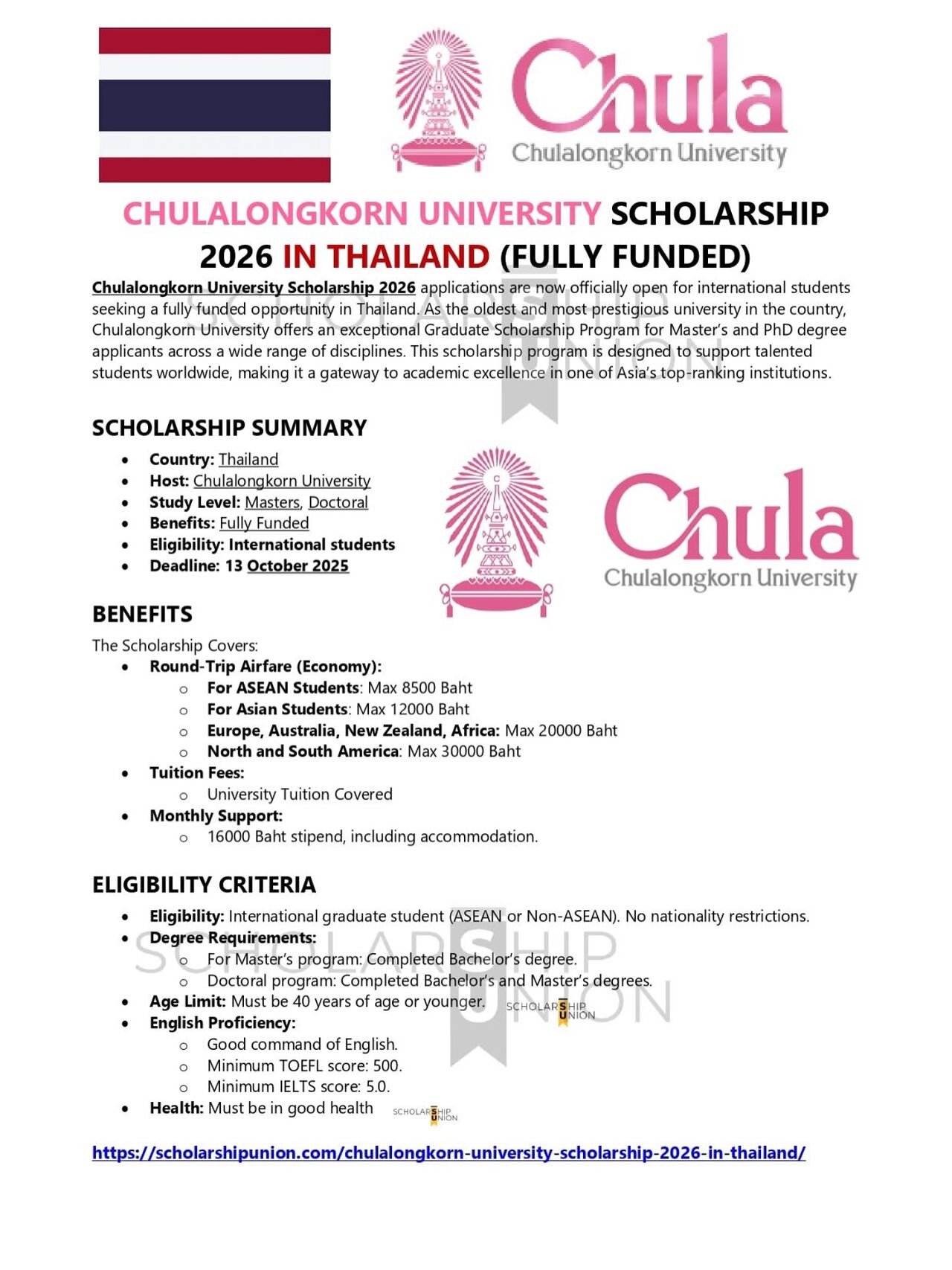 #GraduateScholarship #FullyFunded #StudyInThailand #MastersScholarship #PhDScholarship #InternationalStudents #AcademicExcellence #ScholarshipOpportunity #Thailand2026 #GlobalEducation #HigherEducation #ResearchOpportunities #ScholarshipAlert #FutureLeaders