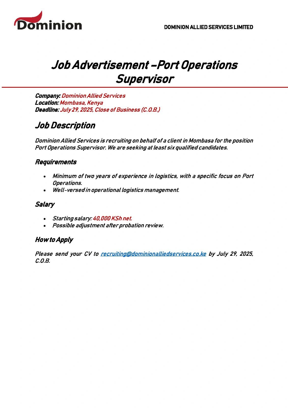 #NowHiring #PortOperations #IkoKaziKE #LogisticsJobs #MombasaJobs #hiring #OperationsSupervisor #CareerOpportunity #DominionAlliedServices #JobAlertKE