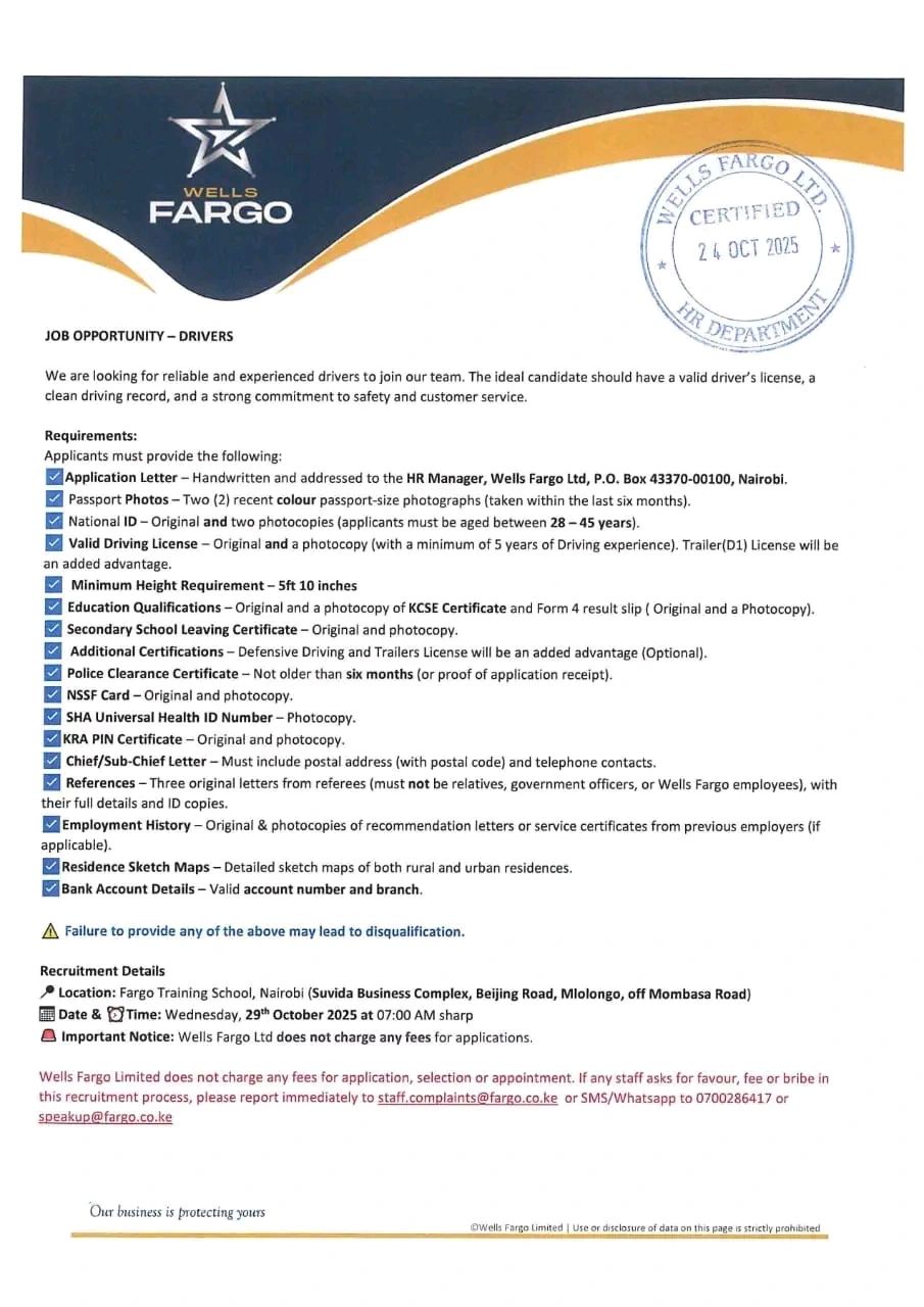 #WellsFargoKenya #JobOpportunity #DriversRecruitment #NowHiring #CareerOpportunity