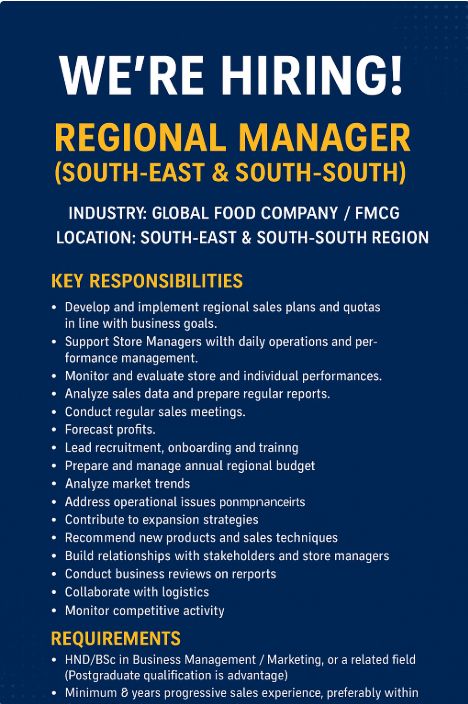#hiringalert #jobsinnigeria #regionalmanager #FMCG #salesjobs #careeropportunity #jobseekers #recruiting #leadership #salesmanagement #jobvacancy #jobsearch #jobs2025 #jobsinafrica #careers #opportunities #businessmanagement #marketing #Ikokazike