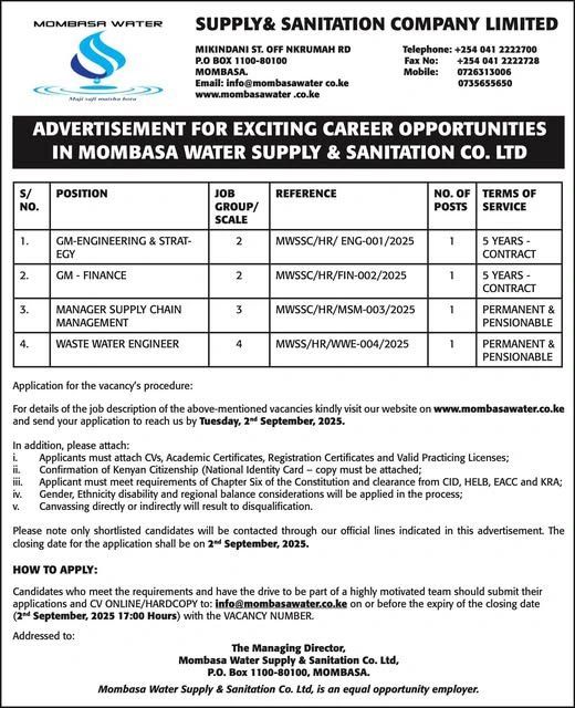 Opportunities at MOMBASA WATER #IkokaziKE #JobSearchKE #JobHuntKE #KenyaJobs #NairobiJobs #JobsKE #CareerKE #HustleKE #JobAlertsKE #JobVacancyKE