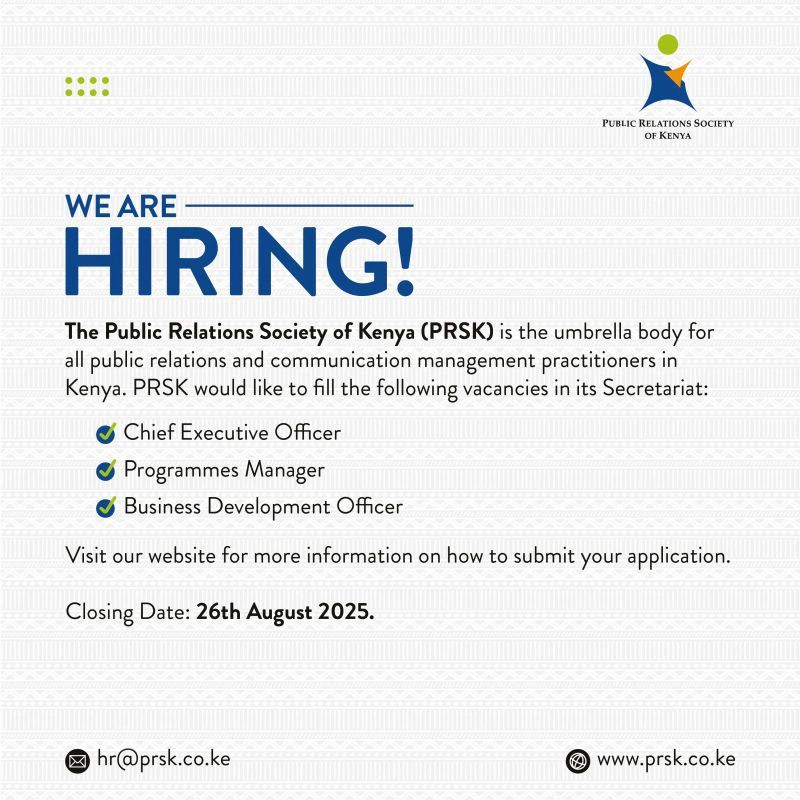 The Public Relations Society of Kenya (PRSK) is growing, and as we progress to the next level, we are expanding our Secretariat to serve you better. We are therefore seeking qualified and passionate professionals to fill the following positions:
